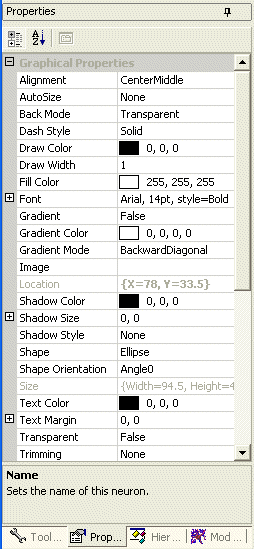 A node is the basic item that shows up in the toolbox. It is the base class for all neurons and other draggable items like graphics, text, and subsystems. Therefore, all items that inherit from node also contain all of its properties. The following is a list of those properties.